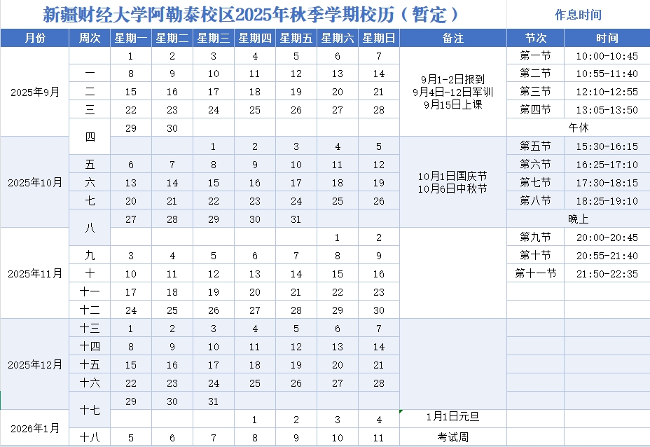 » 球王会体育官方网站阿勒泰校区2025年秋季学期校历(暂定)