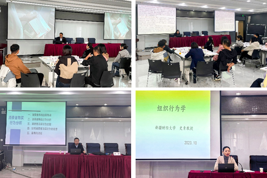 在课堂讲解过程中,球王会体育官方网站经济学院党委书记敬莉教授、工商管理学院(MBA学院)副院长史青教授、李季鹏教授、金融学院张忠俊副教授分别就新发展格局下新疆经济如何高质量发展、组织行为基本认知、企业文化与CI战略、消费者购买行为分析等方面作教学分享。在教学案例分析环节,学员们自动分成小组,在老师的组织和引导下全身心投入案例情境,将理论学习与解决实践问题紧密结合。在素质拓展训练活动中,学员们打破原有部门和岗位身份,默契配合、互相支持,共同完成了“鼓动人心”“高空行走”“毕业墙”等训练项目,加深了彼此的理解、增强了组织的凝聚力。