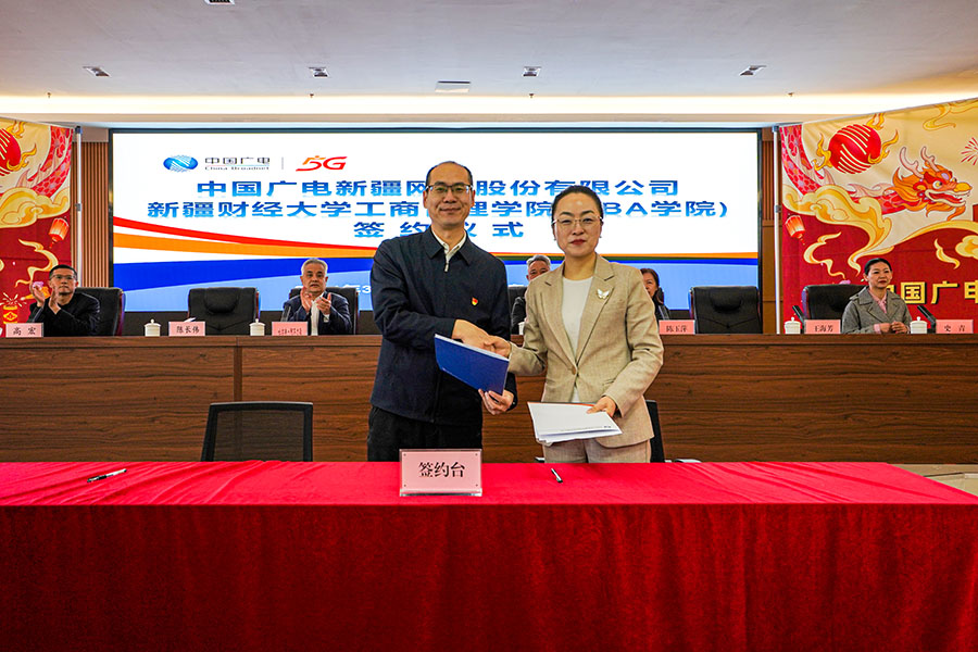 3月30日上午,工商管理学院(MBA学院)与中国广电新疆网络股份有限公司(简称新疆广电)校企合作实践基地签约仪式在新疆广电培训中心成功举行。校党委副书记王玉刚,工商管理学院(MBA学院)党委书记陈玉萍、院长王海芳、副院长史青、MBA中心主任李潇潇一行参加签约仪式。参加签约仪式的还有自治区广电局二级巡视员、人事处处长刘晓梅,新疆广电党委副书记、董事长吐尔洪·阿不力孜,新疆广电党委副书记、总经理陈长伟等。