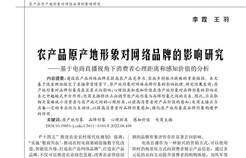 《农产品原产地形象对网络品牌的影响研究-基于电商直播视角下消费者心理距离和感知价值的分析》一文阐述的主要观点为:建设农产品网络品牌是提高农产品竞争力、实施乡村振兴战略的重要路径。本文基于线索理论探究了直播带货情景下,原产地形象对网络品牌形象的影响机理。研究结果表明:原产地形象对品牌形象存在显著正向影响;心理距离和感知价值在原产地形象对品牌形象的影响关系之中起链式中介作用;电商主播特性正向调节原产地形象与品牌形象之间的关系。因此,应采取相关策略减小消费者与原产地之间的心理距离,以提高消费者对产品价值的感知;电商主播应当具备一定的专业性与互动性,以削弱外部信息对消费者对品牌形象感知的影响,强化原产地形象在品牌形象构建中的作用。