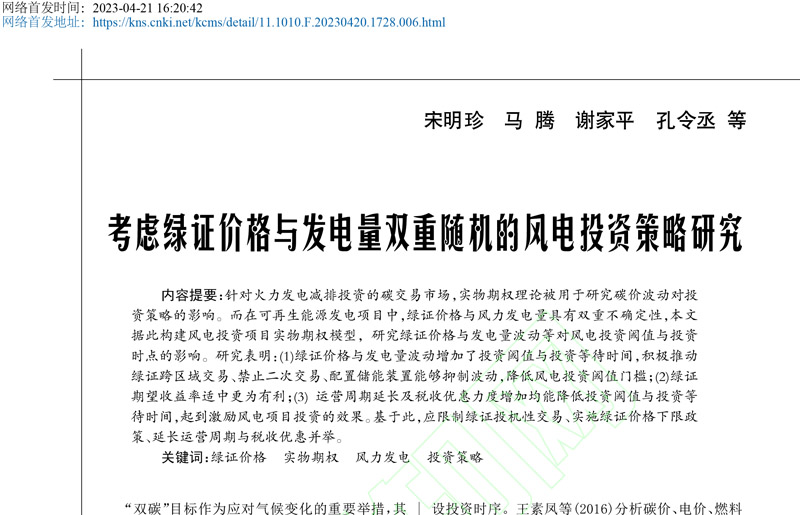 我院运营与供应链管理系宋明珍副教授在核心期刊《价格理论与实践》[北大核心]2023年4月网络首发论文一篇,题目为:考虑绿证价格与发电量双重随机的风电投资策略研究。