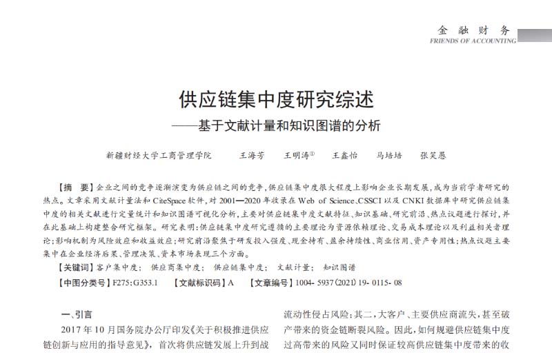 我院创新与战略管理系教授王海芳博士在核心期刊《会计之友》2021年第9期上发表一篇论文,题目为:《供应链集中度研究综述——基于文献计量和知识图谱的分析》,1.2万字。