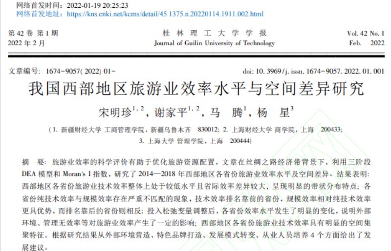 运营与供应链管理系宋明珍老师在核心期刊《桂林理工大学学报》2022年1月19日网络首发一篇论文,题目为:《我国西部地区旅游业效率水平与空间差异研究》。