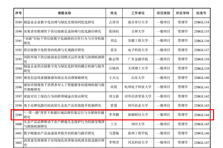 近日,全国哲学社会科学工作办公室公布了2023年国家社会科学基金年度项目和青年项目立项结果。我院李季鹏教授申报的《“一带一路”背景下新疆区域品牌形象定位与全媒体传播研究》喜获立项。