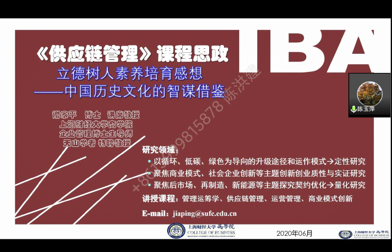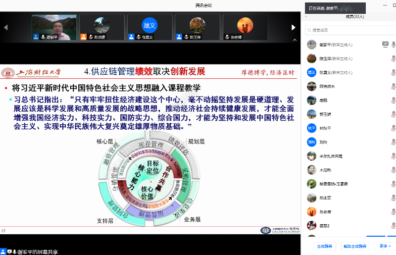 6月11日,上海财经大学商学院讲席教授、博士生导师,上海市曙光学者、新世纪优秀人才、球王会体育官方网站“天山学者”特聘教授谢家平在上海通过腾讯会议云平台为全院教师作了题为《<供应链管理>课程思政之立德树人素养培育感想——中国历史文化的智谋借鉴》的学术报告报告,我院全体教师参加了报告会,院长陈玉萍教授主持了报告会。