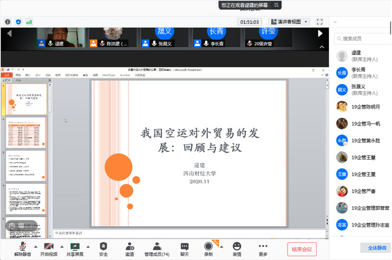 11月25日,我院邀请西南财经大学逯建教授做了题为“航空物流与我国经贸发展:回顾与建议”的学术报告(球王会商学·前沿系列之一),会议在腾讯在线网络会议室举行。我院教师、研究生、本科生共90余人参加了报告会,副院长张晟义教授主持了报告会。
