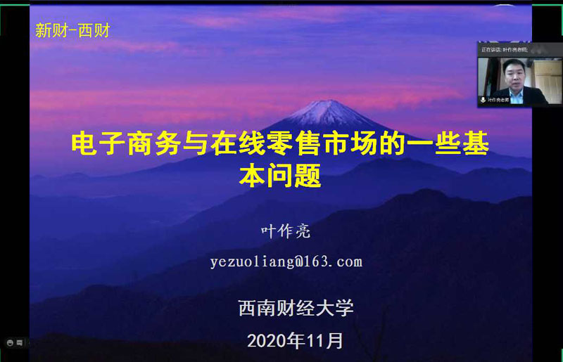11月27日,西南财经大学国际商学院副院长叶作亮教授应我院邀请做了题为“电子商务和在线零售市场中的核心问题”的学术报告(球王会商学·前沿系列之二),会议在腾讯在线会议室举行。我院教师、研究生等60余名师生参加了报告会,院长陈玉萍教授、副院长李长青联合主持了报告会。