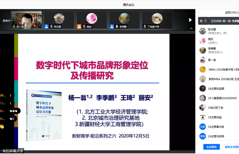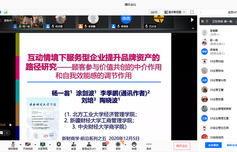 12月05日上午和晚上,北方工业大学经济管理学院杨一翁副教授应我院邀请分别做了题为“互动情境下服务型企业提升品牌资产的路径研究——顾客参与价值共创的中介作用和自我效能感的调节作用”“数字时代下城市品牌形象定位以及传播研究”两场学术报告(球王会商学·前沿系列之五、六),会议于腾讯在线网络会议室举行。我院教师、研究生等50余人师生参加了报告会,第二场报告还吸引300多名MBA学员聆听了报告,李季鹏教授主持了报告会。