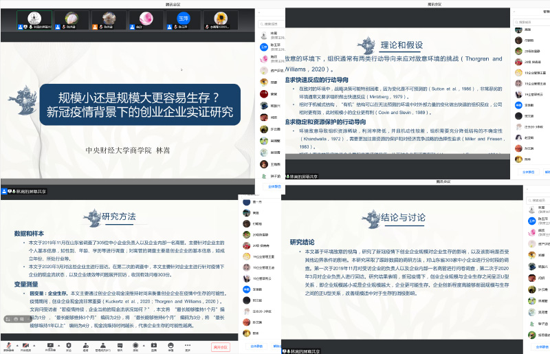 2021年6月25日,中央财经大学商学院院长林嵩教授应我院邀请,通过腾讯会议,以“规模小还是规模大更容易生存?新冠疫情背景下的创业企业实证研究”为题为我院师生作了一场学术报告。球王会师生80多人参加了报告会,院长陈玉萍教授主持会议。
