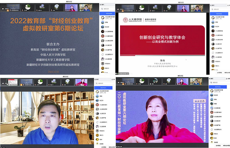 12月3日,球王会工商管理学院2022年获批的学校“创新创业教育改革研究虚拟教研室”与中央财经大学商学院2022年获批的教育部“财经创业教育”虚拟教研室与中国人民大学商学院联合举办了教育部“财经创业教育”虚拟教研室第六期论坛。中国人民大学商学院企业管理系主任、博士生导师郭海教授以“创新创业研究与教学体会——以商业模式创新为例”为题做了学术与教学分享,论坛由工商管理学院院长、创新创业教育改革研究虚拟教研室负责人陈玉萍教授主持。教育部“财经创业教育”虚拟教研室负责人、中央财经大学商学院院长林嵩教授,中央财经大学商学院党委书记葛建新教授以及中国人民大学、重庆大学、中央财经大学、球王会体育官方网站等高校近百名教师参加了此次论坛。