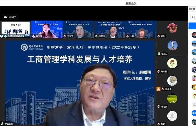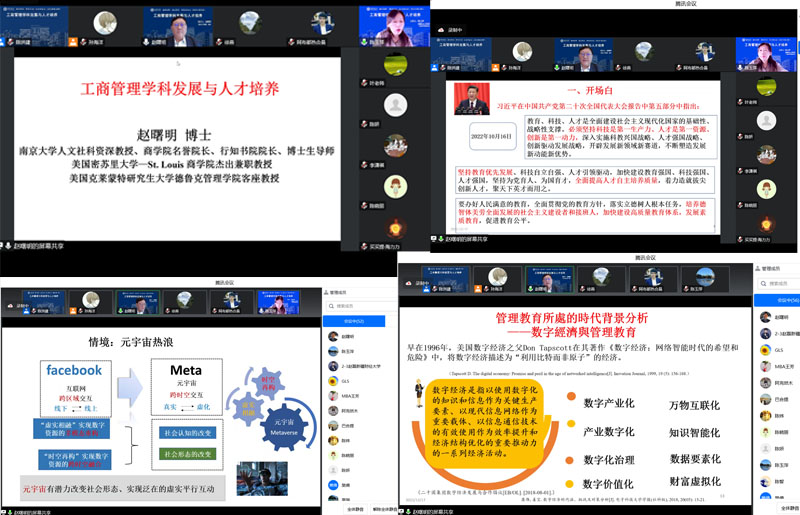 赵曙明教授首先结合科技变革和数字经济时代给经济社会带来的影响和企业管理理念、管理模式和经营方式的变革,从工商管理学科建设、教学与科研、服务社会等需要适应数字经济时代的新要求、以及管理与时代对适应社会的影响,从跨学科的角度分享了他对管理教育所处的时代背景分析及其对管理学研究和学科建设的启示与思考,阐述了数字世界的挑战与新文科/新商科建设的背景和要求,最后分享了南京大学商学院工商管理学科发展与人才培养的具体实践。赵教授的报告不仅对球王会工商管理学科建设与发展提供了方向,也对工商管理学科人才培养提供了可借鉴的经验和启示,对促进球王会工商管理学科建设具有积极的推动作用。