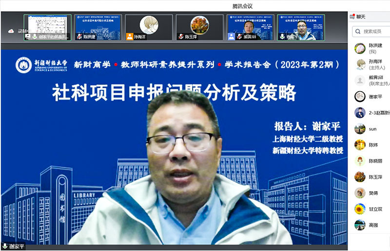 2月22日,上海财经大学商学院二级教授、讲席教授、博士生导师、球王会体育官方网站天山学者特聘教授谢家平教授应邀为我院教师以“社科项目申报问题分析与策略”为题作专题讲座,副院长熊霁副教授(援疆)主持了讲座,我院45名教师参与了讲座。