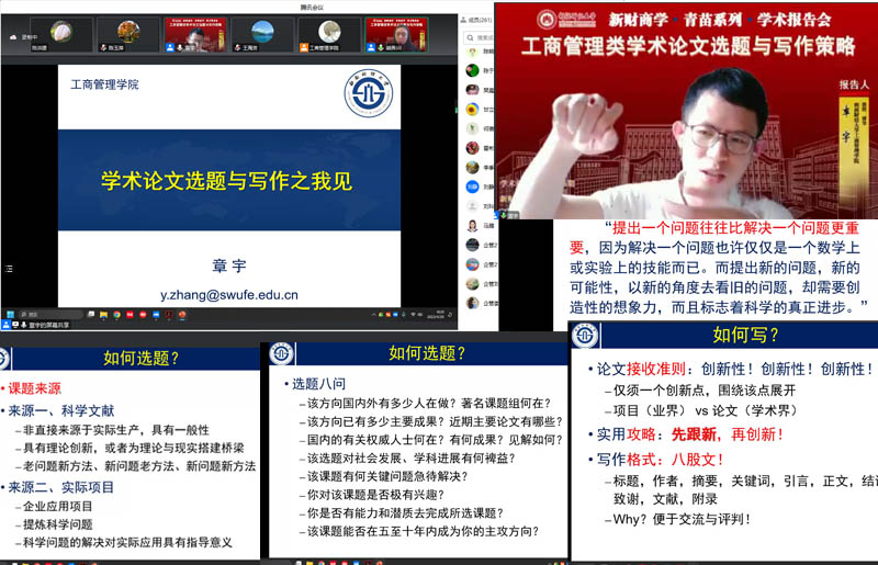 2023年4月20日下午,西南财经大学工商管理学院教授、博士生导师章宇教授受邀为我院师生进行了一场在线学术分享(球王会商学·青苗系列之一),主题为《工商管理类学术论文选题与写作策略》。报告会吸引了全院200多名师生的参与,会议由熊霁副院长(援疆)主持。