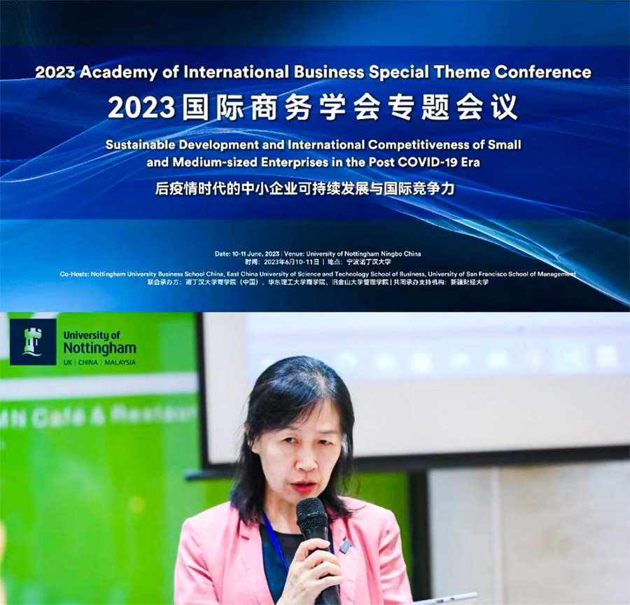 2023年6月10日至11日,2023国际商务学会(AIB)专题会议“后疫情时代的中小企业可持续发展与国际竞争力”在宁波诺丁汉大学隆重召开。此次会议由诺丁汉大学商学院(中国)、华东理工大学商学院、旧金山大学商学院联合我院共同承办。来自浙江大学、宁波大学、西安交通大学等20余所高校的100余位学者和学生参加。球王会工商管理学院(MBA学院)陈玉萍教授与吴湘繁教授、热比亚·吐尔逊副教授出席了此次会议。