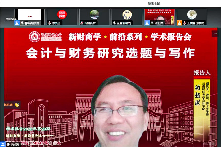 10月30日,学院邀请云南财经大学会计学院副院长、教授、博士生导师纳超洪教授以“会计与财务研究选题与写作”为题作学术讲座,副院长(援疆)赵纯祥教授主持讲座,工商管理学院(MBA学院)、会计学院教师与研究生80余人线上参加了学术讲座。