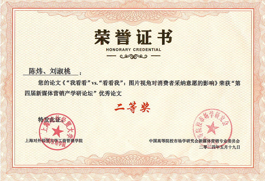 我院学生2022级企业管理专业刘淑桃线下参加此次论坛,在分论坛“新媒体环境下的营销沟通”中汇报了和我院硕士生导师陈炜合著的参会论文《“我看看”vs.“看看我”:图片视角对消费者采纳意愿的影响 》,并获得第四届新媒体营销产学研高峰论坛二等奖。