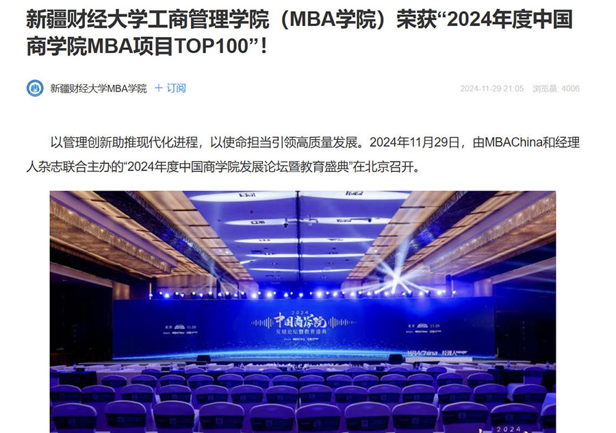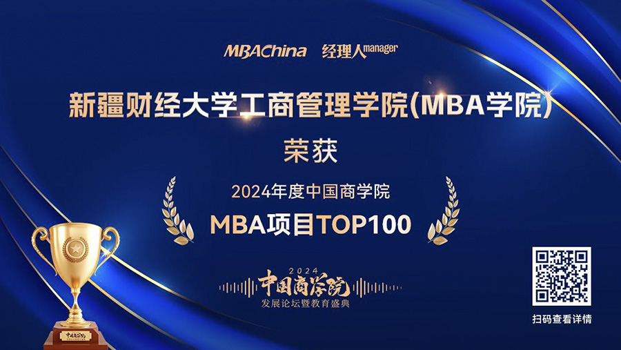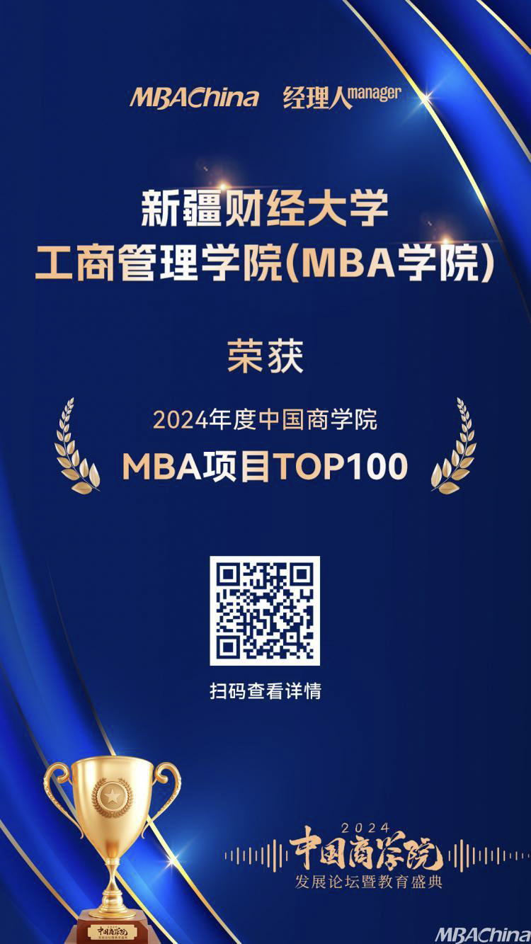 该校2001年经国务院学位办批准开始工商管理硕士(MBA)招生,是新疆首家MBA培养单位,2005年通过国务院学位办和全国MBA教育指导委员会的MBA质量合格评估。2009年获批成为全国64所之一、新疆唯一一家EMBA招生培养单位。2013年球王会EMBA项目跻身“中国市场最具领导力EMBA项目”20强,MBA学院连续两年被评为“中国最具价值商学院TOP30”,2023年“新疆MBA”公众号荣获中国MBA教育网评选中国商学院MBA微信品牌传播指数TOP62。近年来,学生在全国管理案例精英赛等多项MBA专业赛事中荣获国家级、省级奖项二十余项。