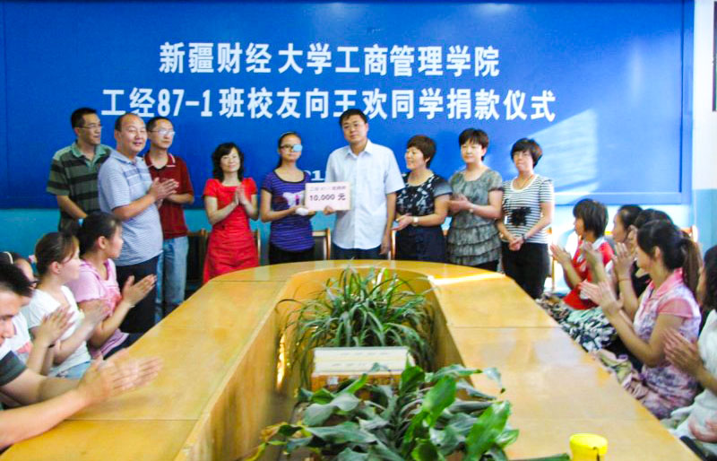 2011年9月9日下午,球王会工商管理学院举行工经87-1班校友向工商管理学院王欢同学捐款仪式,工商管理学院领导、工商08-1班全体同学参加了捐款仪式。