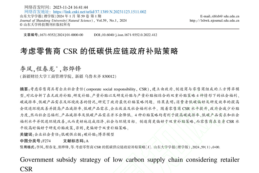 我院运营与供应链管理系副教授李凤博士、硕士研究生程春龙、郭烨锋同学合作论文在核心期刊《山东大学学报(理学版)》(北大核心)2023年11月网络首发,计划在2024年第1期上发表,题目为:考虑零售商CSR的低碳供应链政府补贴策略。