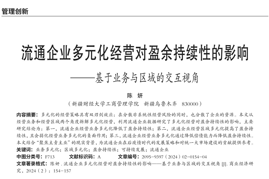 陈妍老师论文《流通企业多元化经营对盈余持续性的影响——基于业务与区域的交互视角》一文在《商业经济研究》发表