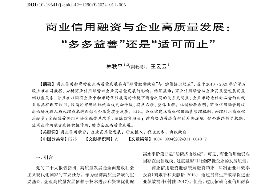 林秋平副教授论文《商业信用融资与企业高质量发展:“多多益善”还是“适可而止”》一文在《财会月刊》发表