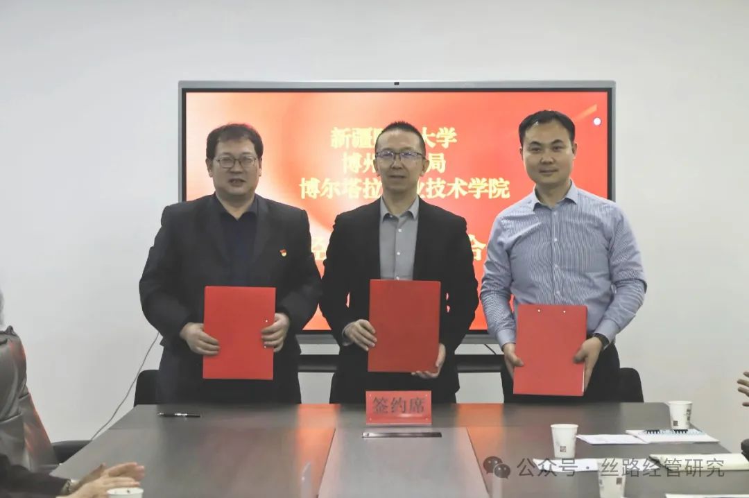 7日上午,球王会体育官方网站统计与数据科学学院院长、丝路经济与管理研究院执行院长何剑一行前往博尔塔拉职业技术学院就服务地方经济发展科研合作进行座谈交流,并签署丝路经济与管理研究院与博尔塔拉蒙古自治州商务局、博尔塔拉职业技术学院商学院达成的合作协议,会议由博尔塔拉职业技术学院党委委员、副校长唐晓春主持,博州商务局副局长魏锋出席签约仪式。三方确立在博尔塔拉职业技术学院设立博尔塔拉蒙古自治州经济高质量发展研究基地,将在人才培养、智库合作、学术交流等方面深入开展协作,通过共建新型特色智库平台,为博州经济高质量发展提供智力支持,为自治区党委提供决策依据。
