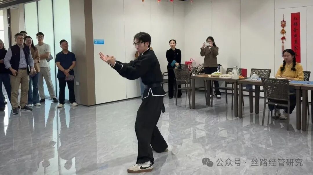 表演开始前,我院辛雨潇老师以英语为沟通桥梁,介绍了张学儒所展示的中华武术咏春拳的历史渊源及文化价值,并与各位参会专家就“跨国文化交流长效机制构建”“丝路沿线复合型经济管理人才共育”等内容展开了细致的交流。
