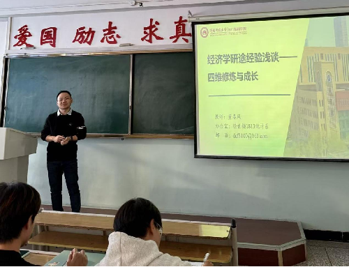 董春风老师以“经济学沿途经验浅谈-思维修炼与成长”为主线,结合自身经历剖析统计学与多学科融合,强调培养“问题意识”,介绍文献梳理等方法,重点分享大论文撰写过程,鼓励提前动笔、与导师沟通、规律作息,祝愿大家把论文写在祖国大地上。