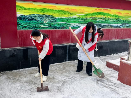 志愿者们高效协作,手持清扫工具对养老院庭院、步道的积雪进行集中清理,针对路面结冰区域,小心击碎冰层并铲除残留碎冰。全程动作有序、相互配合,为老人们的出行安全筑牢防护墙,用实干彰显青年责任。
