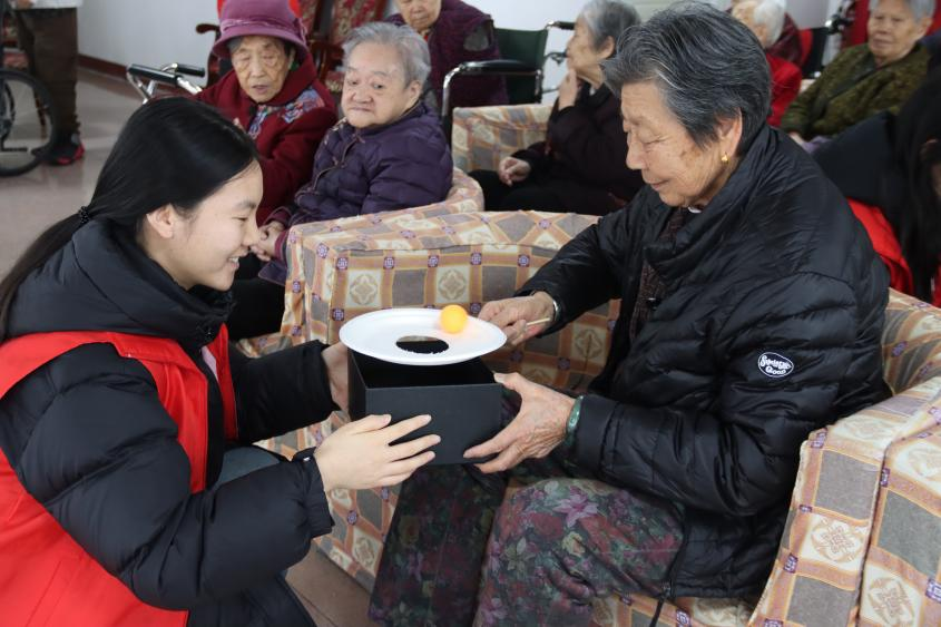 志愿者们以精心筹备的文娱节目与趣味游戏,为老人们编织了一段欢乐时光。“调皮乒乓球”环节中,大家耐心引导老人们倾斜圆盘、操控小球,专注的神情与成功掉落的欢呼交织成趣;随后,志愿者们献上提前准备的舞蹈表演,灵动的舞姿搭配耳熟能详的经典旋律,引得老人们纷纷拍手叫好,老人们更是跟着节奏轻晃身体、哼唱曲调,庭院里的欢声笑语与冬日暖阳相融,满是温馨惬意。