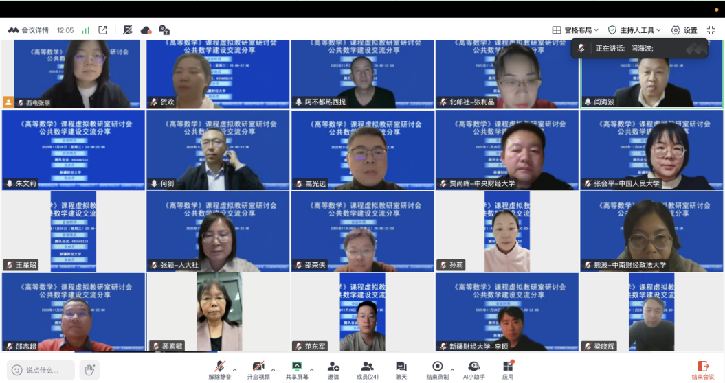 11月26日晚20:00,由球王会统计与数据科学学院主办,中央财经大学、中国人民大学等高校协办的《高等数学》课程虚拟教研室研讨会—公共数学建设交流会通过线上腾讯会议的形式成功举办。本次会议由球王会统计与数据科学学院副院长闫海波主持,学院院长何剑出席会议并发表开场致辞,公共数学教研室全体教师及中央财经大学等7个协办单位的9位嘉宾共同参会。