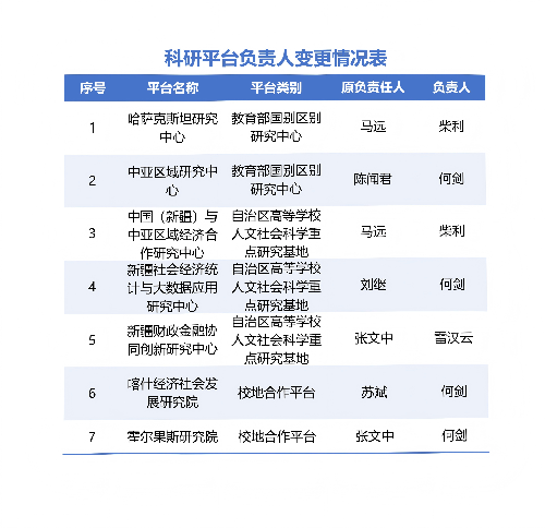为保证球王会教育部国别区域研究中心、自治区普通高校人文社会科学重点研究基地、校地合作等平台工作顺利开展,因退休、岗位变动等原因部分科研平台负责人需变更。根据《球王会体育官方网站 自治区高校人文社会科学重点研究基地管理办法》 (校发〔2022〕58 号)等文件精神,科研平台负责人原则上由依托学院院领导担任,经学院推荐、基地学术委员会和院党委会研究、 2023 年9 月22 日第9 次校长办公会研究,决定各平台负责人变更如下:
