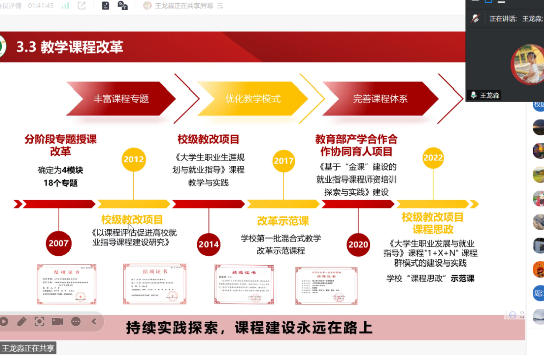 在谈到课程建设时,王龙淼老师以石河子大学“大学生职业发展与就业指导”课程改革及建设为例,介绍了学校在课程目标设定、模块化教学改革、实践教学强化、师资队伍培养等方面的探索。此外,他还分享了学校在推动基层就业、深化校企合作、建设专业化团队等方面的典型做法与成效。