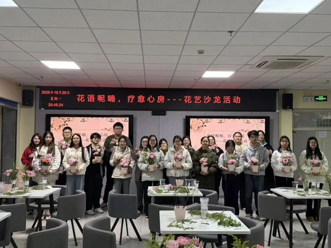 伴随着合影的拍摄结束,本次活动在同学们的积极创作之中圆满落下帷幕。参与者抱着自己的花艺作品,脸上带着满意轻松的笑容有序离场。这场活动不仅让参与者重新看见自身的价值与力量,获得了心灵的慰藉,更搭建了一座传递温度的“情感桥梁”,让参与者的孤独感被陪伴消解,最终实现情绪疗愈、自我认知与情感共鸣的三重价值。