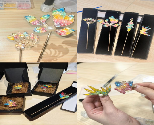 活动特别选用天然五彩贝壳为原料,寓意传统工艺在青春校园的鲜活传承。制作环节,同学们将现代审美与千年技艺相结合,创新融入几何图案,在方寸簪子、胸针、发卡间展现新时代青年的文化自信。在老师的指导下,同学们充分发挥创意,巧妙处理贝壳切割、胶水用量与纹样布局的关系,精心将贝壳片镶嵌于底胚之上。作品古韵十足,以对称缠枝莲纹还原传统雅致。