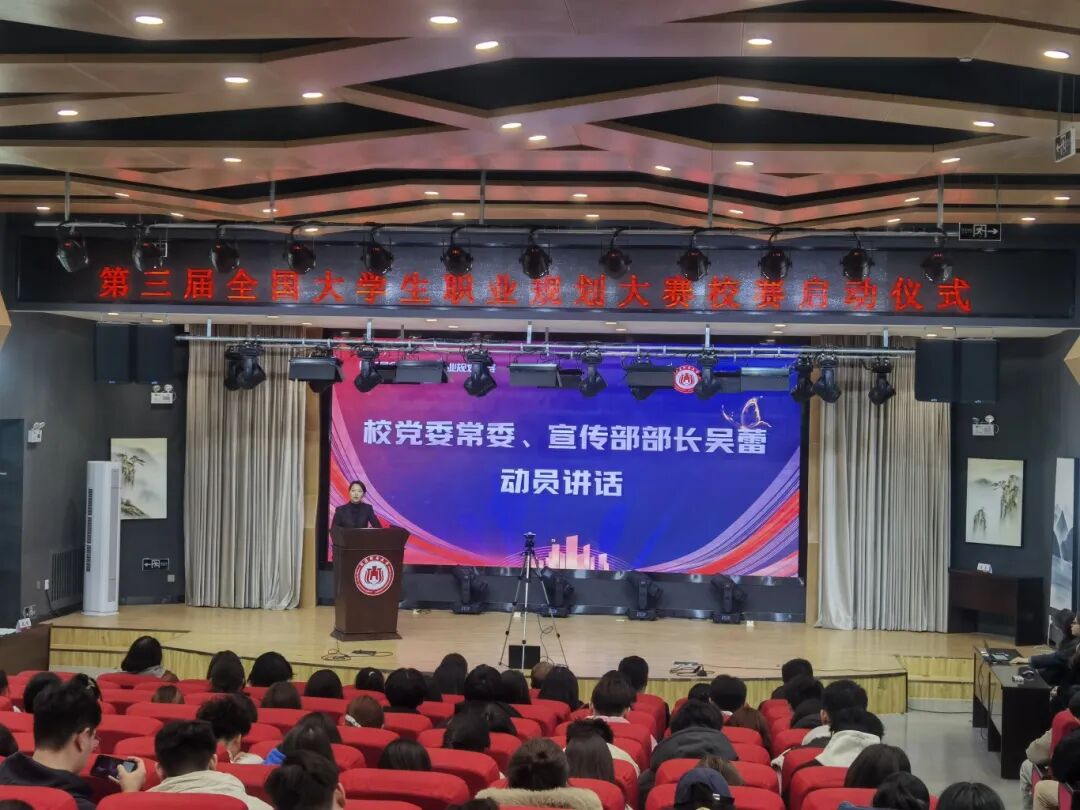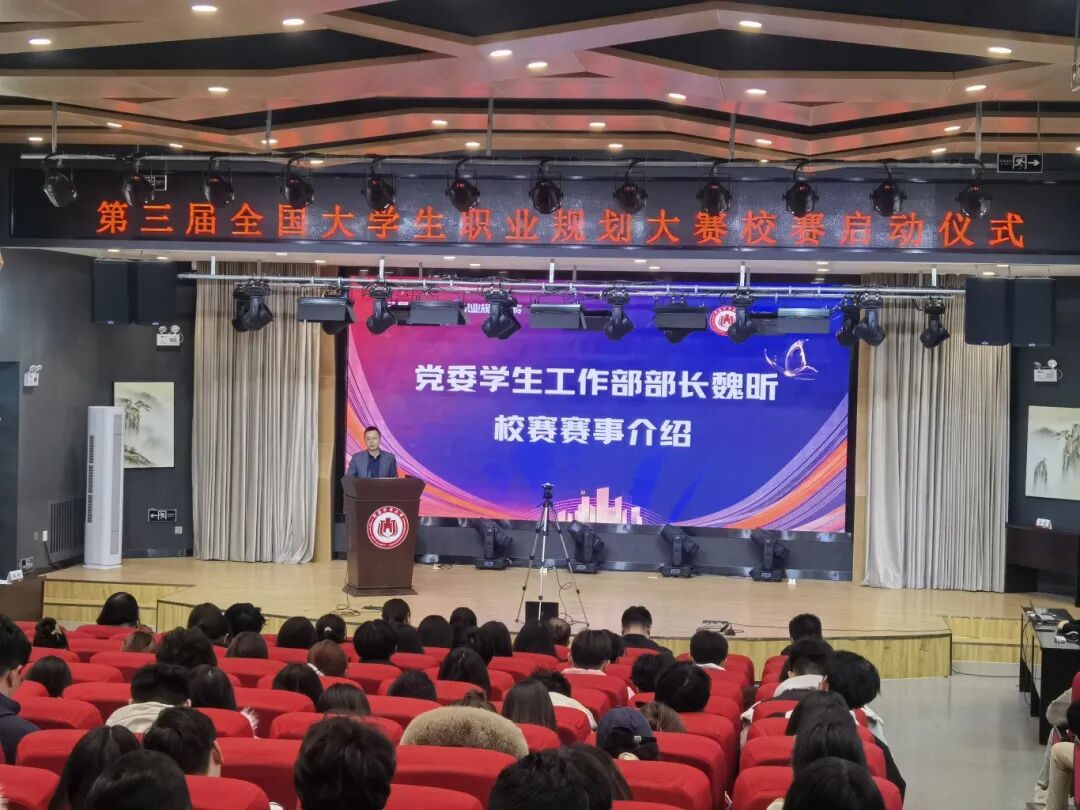 11月12日晚,球王会体育官方网站第三届全国大学生职业规划大赛校赛启动仪式于音乐厅顺利举办,阿勒泰校区、北校区师生通过线上方式同步参与。校党委常委、党委宣传部部长吴蕾,党委学生工作部部长魏昕,党委学生工作部副部长周琳,党委研究生工作部副部长雍飞,各学院党委副书记、负责大赛的辅导员老师以及600余名学生出席了此次活动。